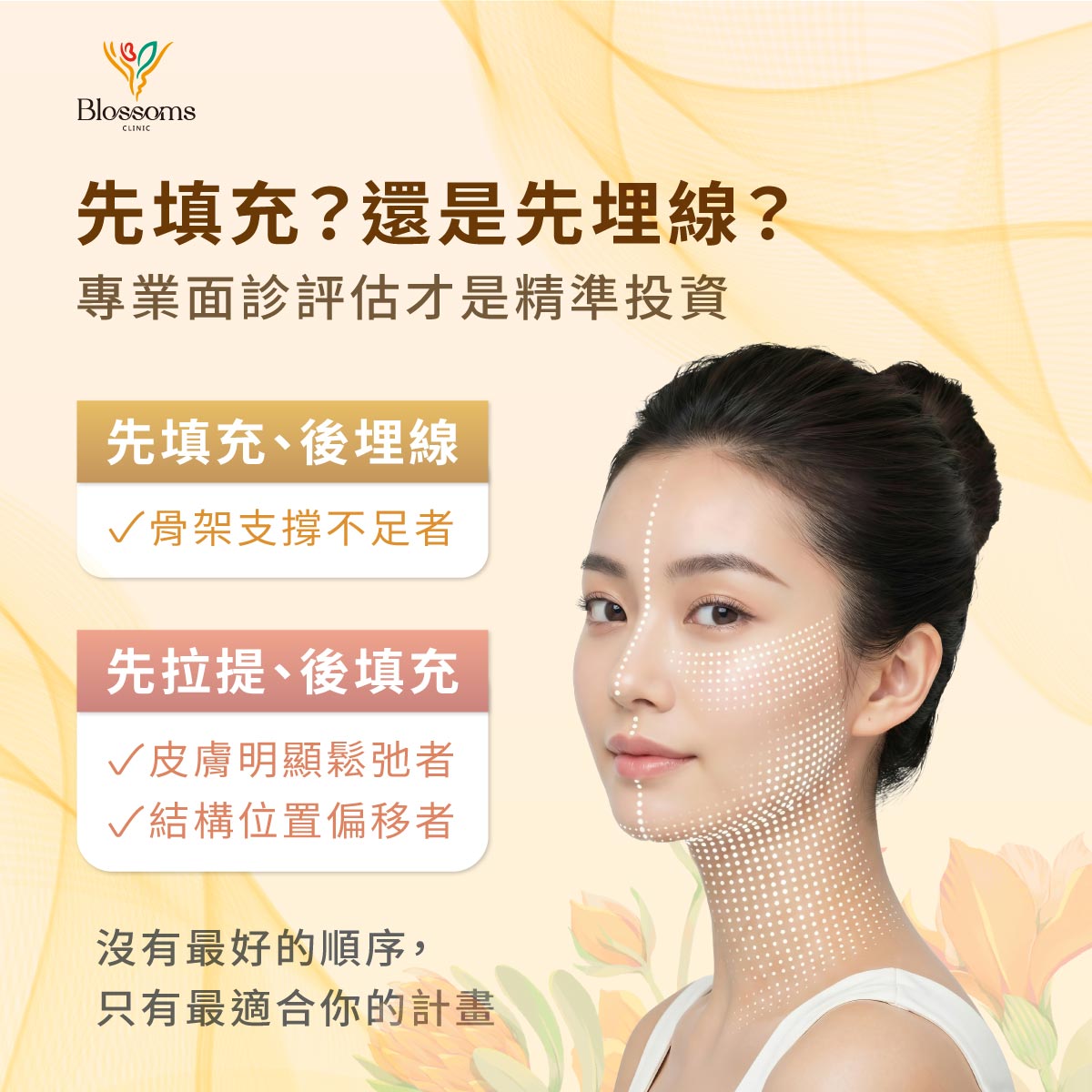 例如,有些醫師會建議「先補充流失的體積,再做埋線拉提」,因為填充分量,有助於讓埋線有足夠的支撐地基,讓線材能更牢靠勾住組織進行提拉。另一些情況,當皮膚鬆弛、結構位置已經偏移時,先埋線或先做緊緻提升,再回來做填充也有意義。整體而言,目前的醫學共識是:沒有「一個流程適合所有人」,而是要依個人臉部老化型態與目標,安排最合適的順序與手段。