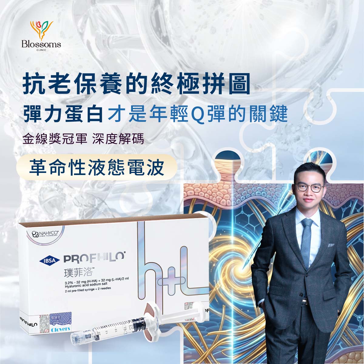當精緻的臉龐失去回彈力,單靠傳統填充已無法滿足頂級抗老的需求。被全球醫美界譽為「液態電波」的革命性療程—PROFHILO 逆時針,正以其獨步全球的專利技術,為熟齡肌膚按下時光暫停鍵。今天,我們邀請到金線獎冠軍、花千樹形象美學診所院長許庭嘉醫師,帶您深度解碼這場關於「彈力蛋白」的青春革命。